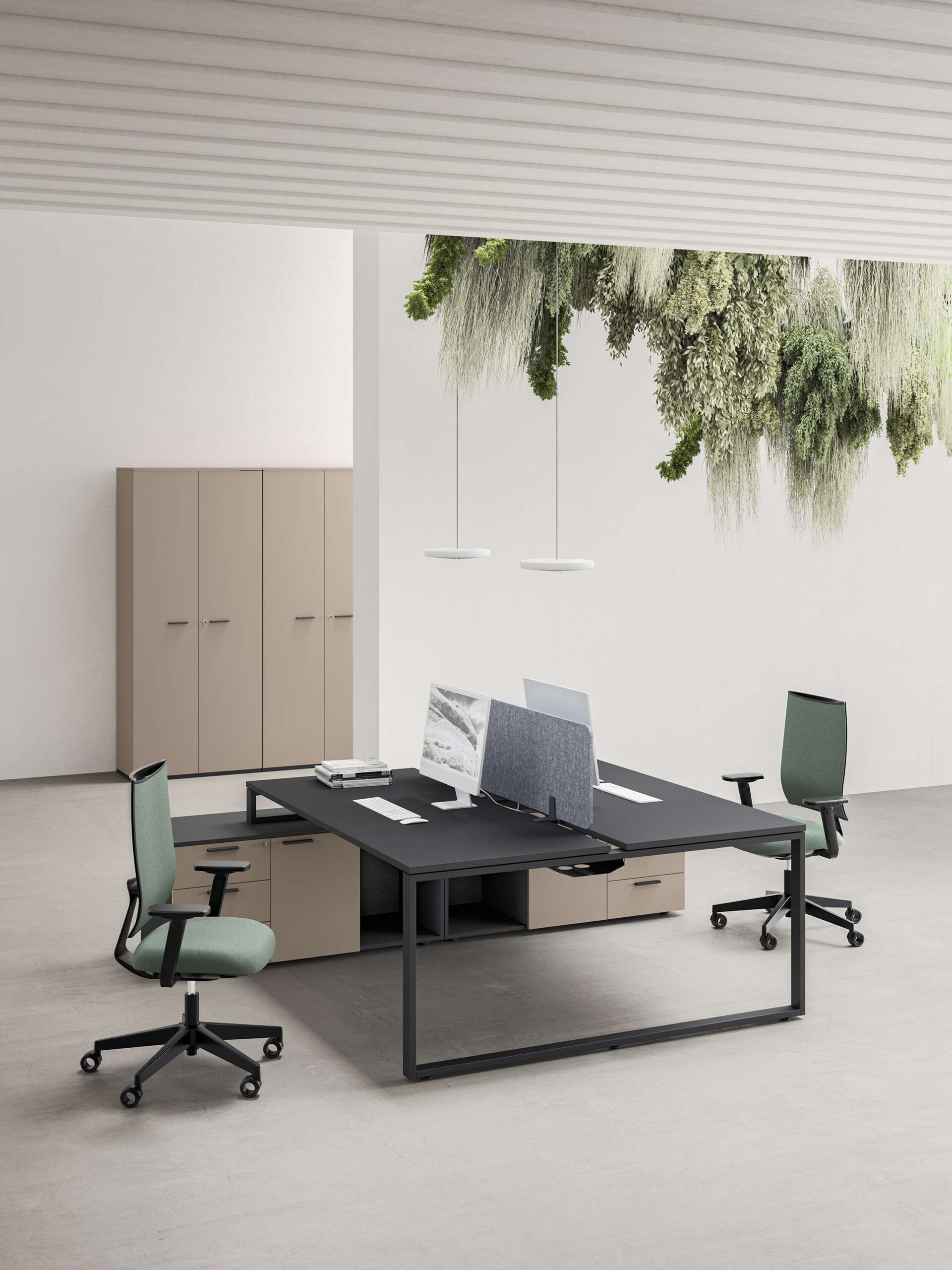 Inoltre, particolare attenzione è dedicata al comfort visivo e acustico. Gli screen e i modesty panel fonoassorbenti, disponibili in feltro, melaminico, termoformato o rivestiti in tessuto, garantiscono privacy e benessere, contribuendo a un ambiente di lavoro più sereno e concentrato.