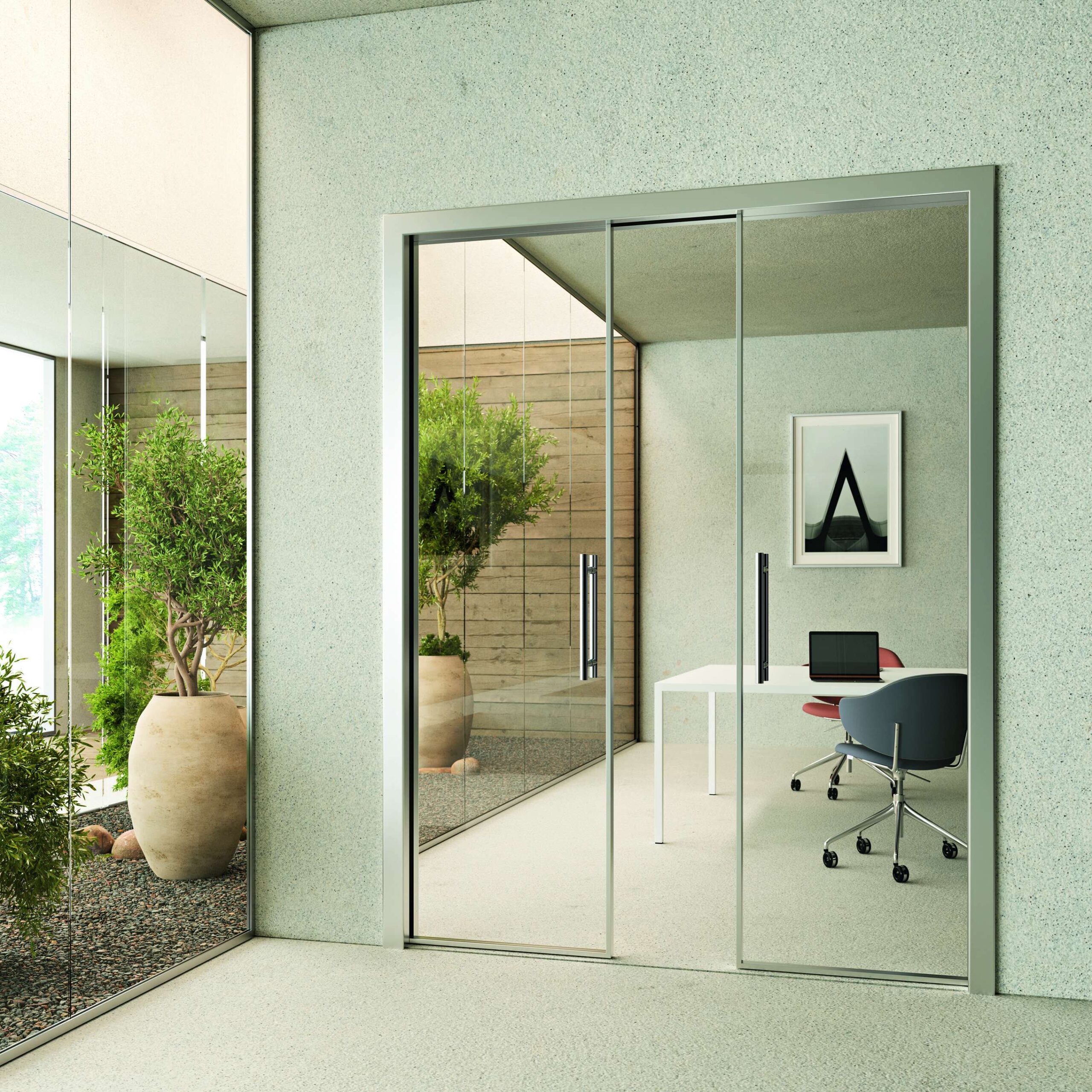 Porte su muratura garantiscono integrazione funzionale anche grazie alla possibilità di montare i divisori e le porte direttamente su pareti in muratura, assicurando stabilità e funzionalità. Il sistema di installazione è studiato per essere discreto e affidabile, mantenendo l’estetica pulita e ordinata.